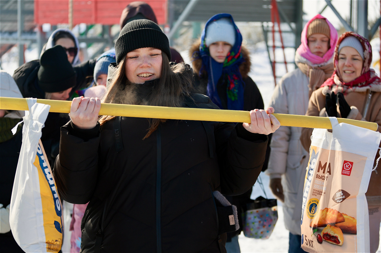 Мужчины выполняли отжимания с 20 кг муки на спине или поднимали штангу такого же веса в парке «Притяжение». Женщины грациозно поднимали штангу с 10 кг муки.
